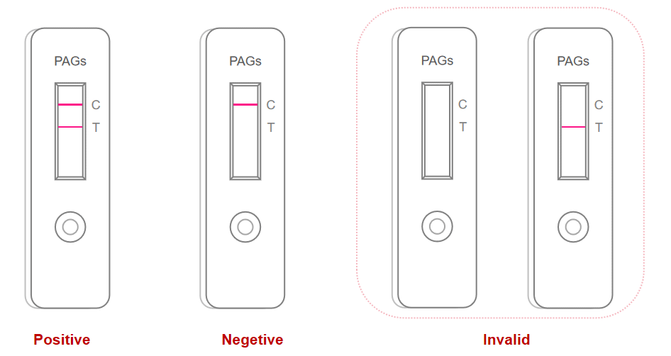 - Недействительный: Контрольная полоса (C) отсутствует → Повторите тест с новой кассетой.